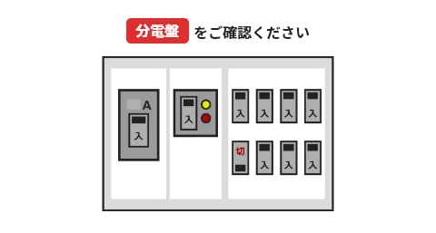 分電盤のブレーカーが下りていないかご確認ください。電気の使い過ぎ、漏電、雷によるショック等によって、電気が消えることがあります。 ブレーカーが下りている場合は、お使いの電気製品の数を減らしてから、ブレーカーを上げてください。